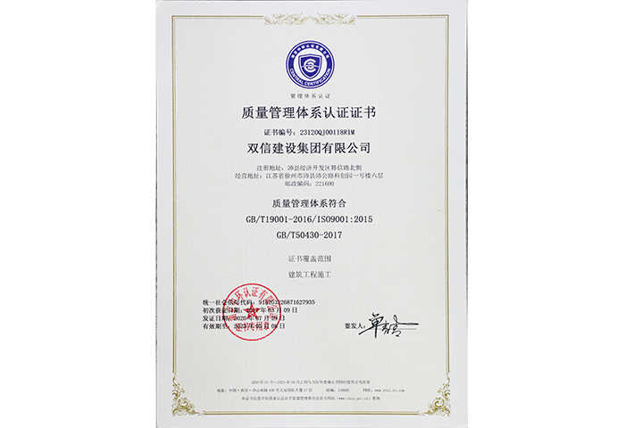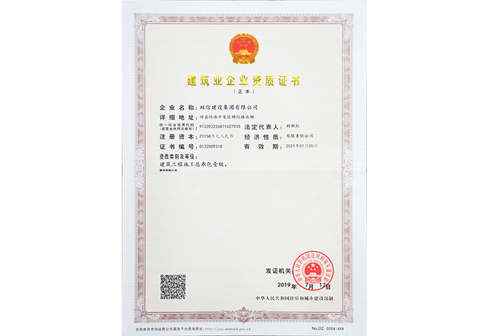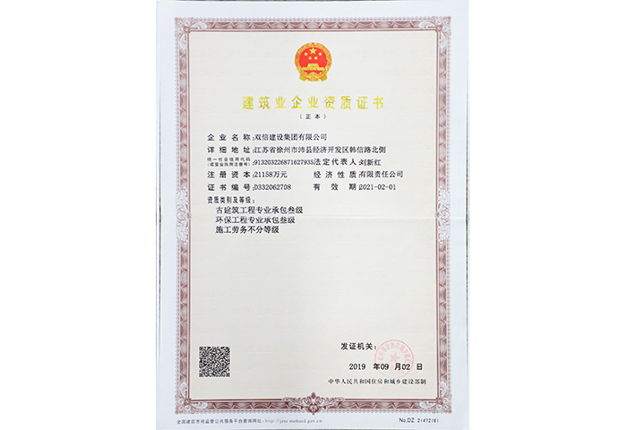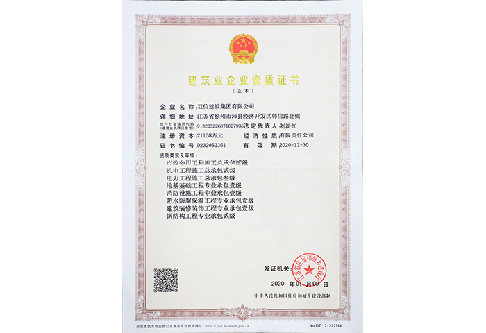 双信建设集团有限公司成立于2009年3月26日,总部位于江苏沛县经济开发区科技创业园,企业注册资金21158万元,主要从事建筑工程施工总承包贰级,市政公用工程施工总承包贰级,机电工程施工总承包贰级,地基基础工程专业承包壹级,消防设施工程专业承包壹级,防水防腐保温工程专业承包壹级,建筑装修装饰工程专业承包壹级,钢结构工程专业承包贰级,电子与智能化工程专业承包贰级,古建筑工程专业承包贰级,环保工程专业承包贰级,桥梁工程专业承包贰级,电力工程施工总承包贰级,施工劳务专业分包等业务。