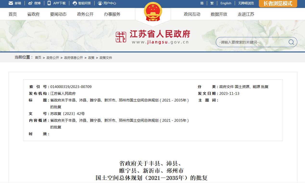 省政府关于丰县、沛县、睢宁县、新沂市、邳州市国土空间总体规划(2021-2035年)的批复(苏政复〔2023〕42号) 徐州市人民政府:你市关于丰县、沛县、睢宁县、新沂市、邳州市国土空间总体规划(2021-2035年)的请示…