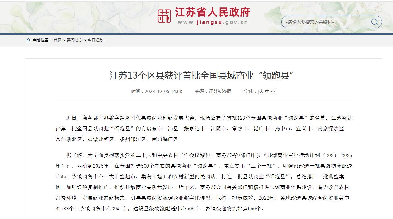 江苏13个区县获评首批全国县域商业“领跑县”近日,商务部举办数字经济时代县域商业创新发展大会,现场公布了首批123个全国县域商业“领跑县”的名单。江苏省获评第一批全国县域商业“领跑县”的有启东市、沛县、张家…