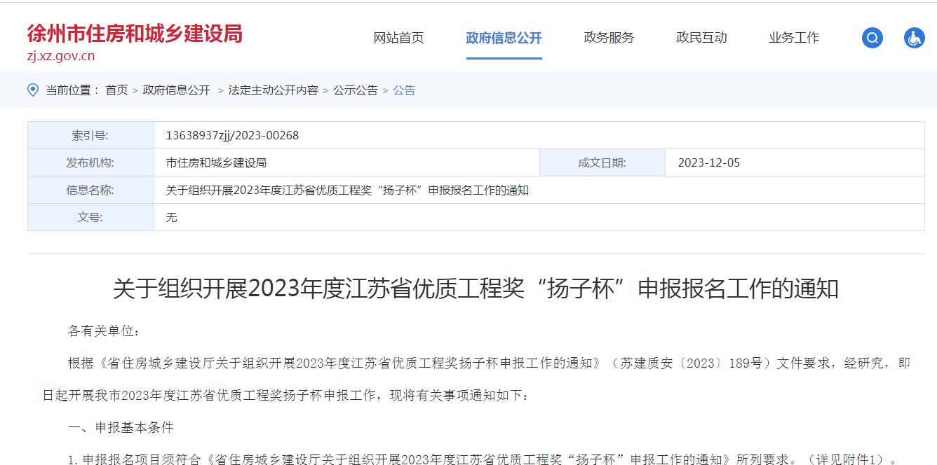 省住房城乡建设厅关于组织开展2023年度江苏省优质工程奖扬子杯(省外)申报工作的通知苏建函质安〔2023〕593号厅驻外办事处(首席代表),各出省建筑业企业:为进一步提升出省建筑业企业创优创先意识,擦亮“江苏建造…