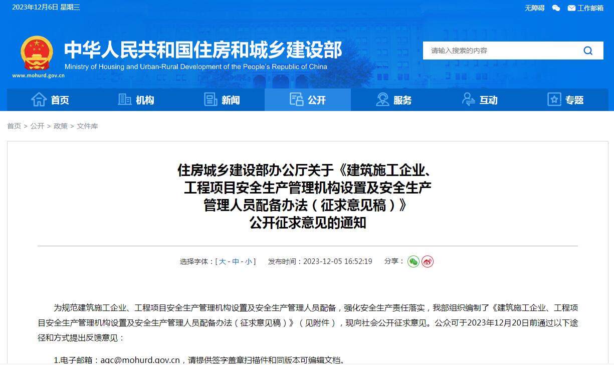住房城乡建设部办公厅关于《建筑施工企业、工程项目安全生产管理机构设置及安全生产管理人员配备办法(征求意见稿)》公开征求意见的通知选择字体:[大-中-小] 发布时间:2023-12-05 16:52:19 分享: 为规范建筑施…